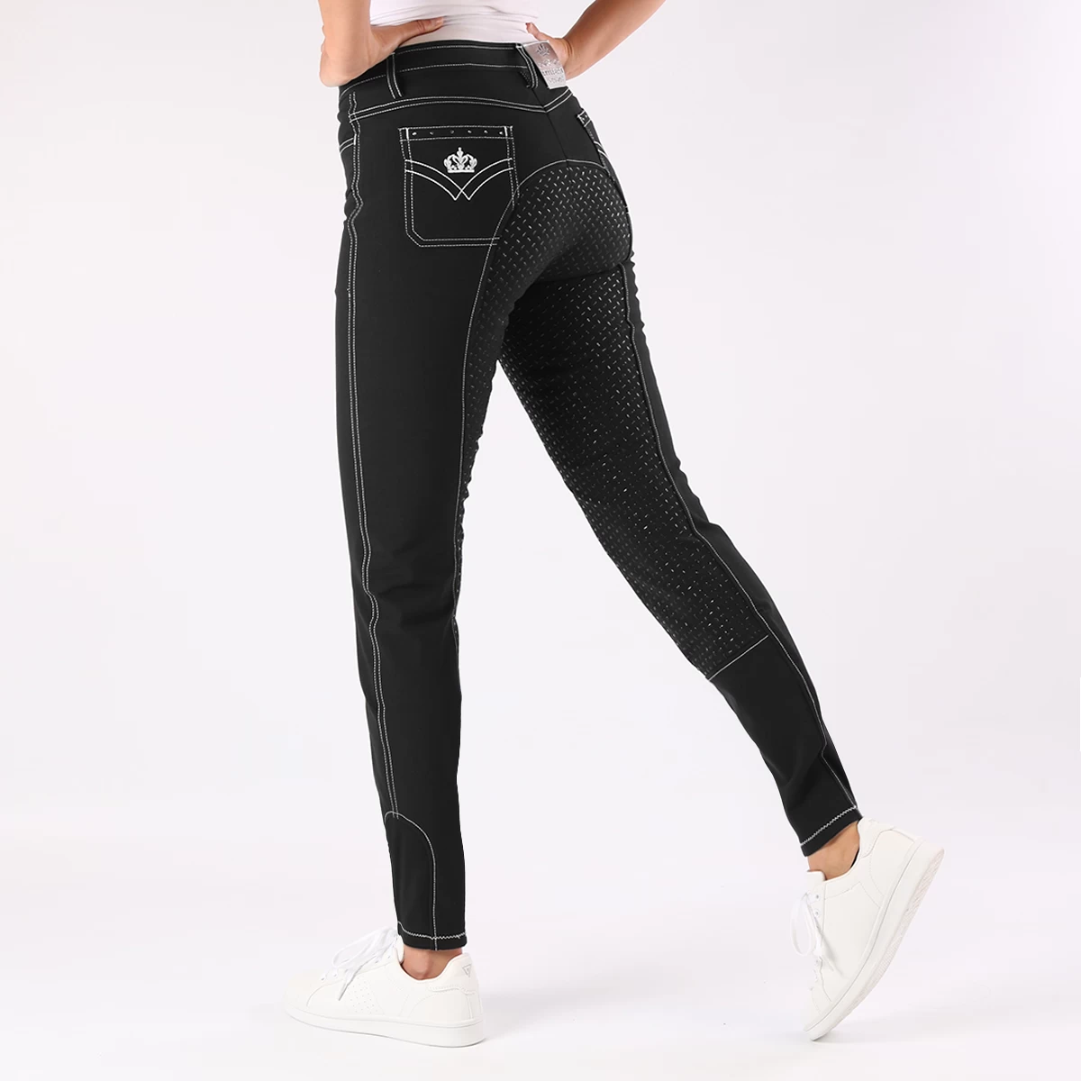 - afgewerkt met strass steentjes en kroontje op de achterzak